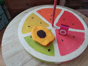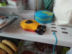 To make this pouch, I used orange, yellow and brown fabrics. I cut into the orange and the yellow fabrics two pieces to imitate the apricot shape. And in the brown fabric I cut out an oval round for the nucleus. I sewed together the orange and the yellow pieces, then I sewed the brown one on the yellow side. And that’s basically all I did. At first I wanted to do something to close but it appeared to me it wasn’t necessary.