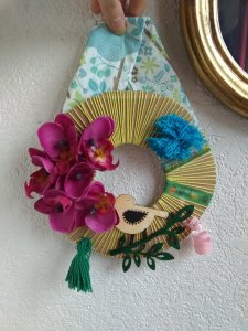 For this hanging wreath, I used a cardboard circle, wrapped it with yellow cotton thread. Then I decorated with washi tape, pompom, little wood bird figurine, tassel, ribbon and fake flowers I glued all over. To hang it up, I took a spring themed paper napkin. I folded it and glued the two ends on the back of the wreath.