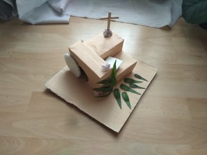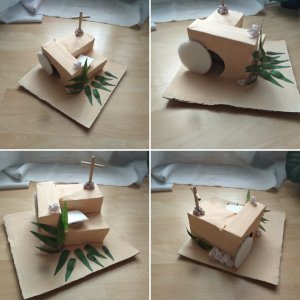 For the Easter Morning part, I made a cavity into the structure and glued a round piece of cardboard to imitate the stone closing the tomb.
