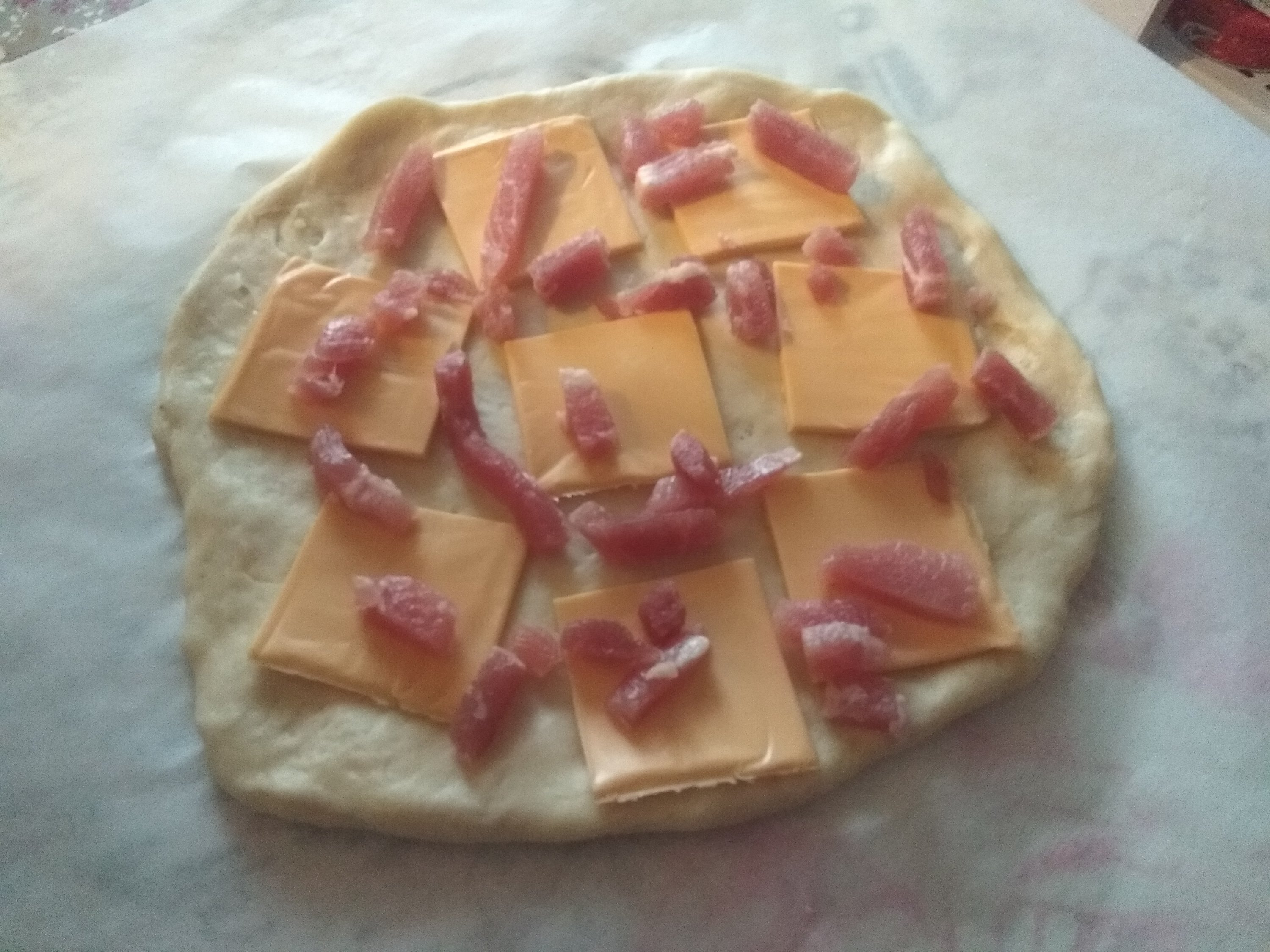 Display on the dough pieces of cheese(any kind) and bacon.