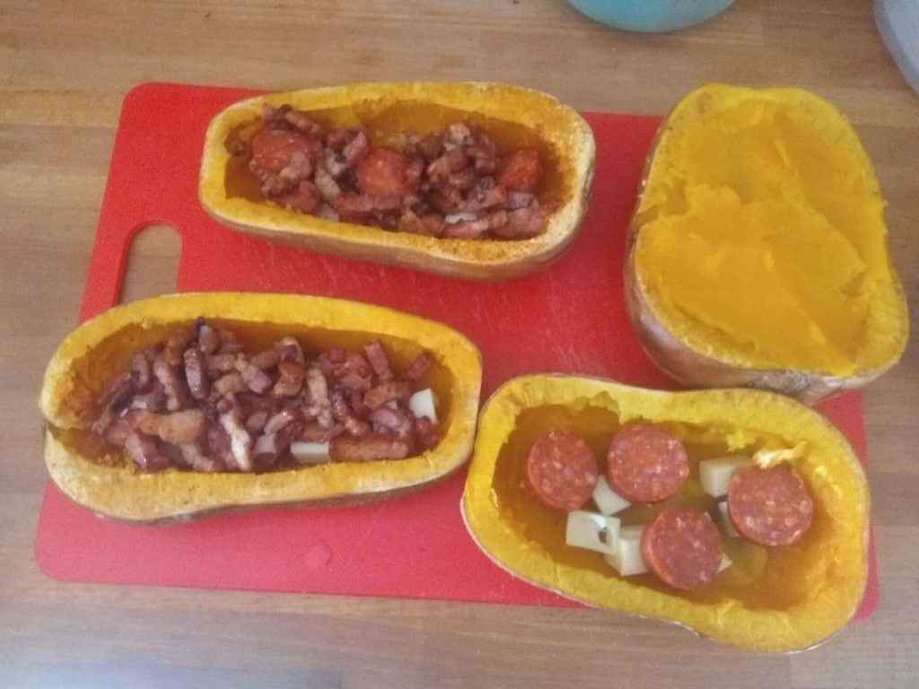 Fill up with the bacon-chorizo mix and some cheese pieces, then cover it back with the pulp and smooth the top.