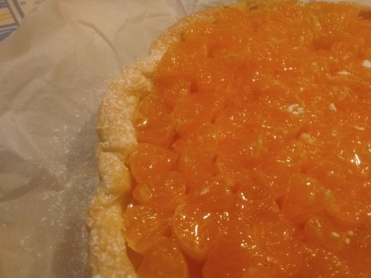 Peel off the mandarins and then cut every wedges in 2 pieces. Then, fill up the empty pastry with the custard you made at the beginning of the recipe. Fill it as evenly as possible. Finally, stick the mandarin half-wedges into the custard, pointy ends down and cut sides up. Fill it all the way until there’s no sight of the custard underneath anymore.